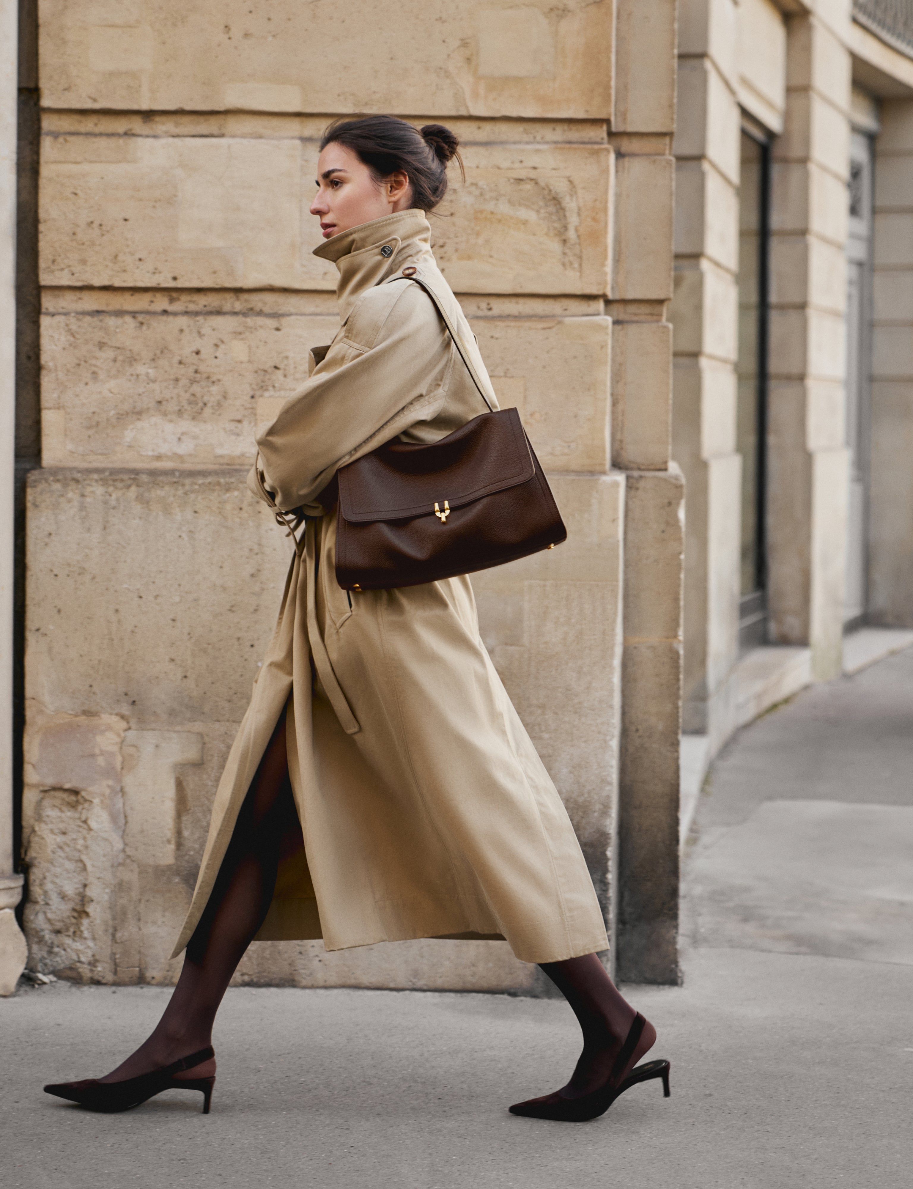 Leather baguette bag in italien leather. Brass turnlock clasp 'Diapason'. Comes with two shoulder straps of different sizes to wear crossbody or short, on the shoulder. Pression pocket on the back. Beige suede lining. Handmade in Italy.