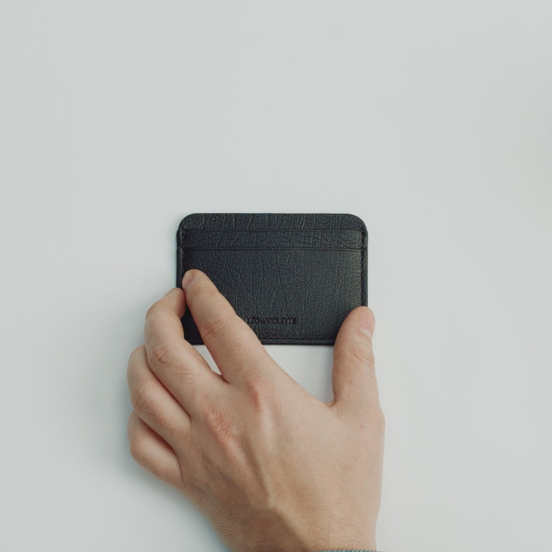 Porte-cartes recto verso avec fente centrale en cuir de veau issu de tannerie italienne certifiée LWG. Doublure en cuir. Capacité totale maximum de 9 cartes. Logo embossé à chaud.